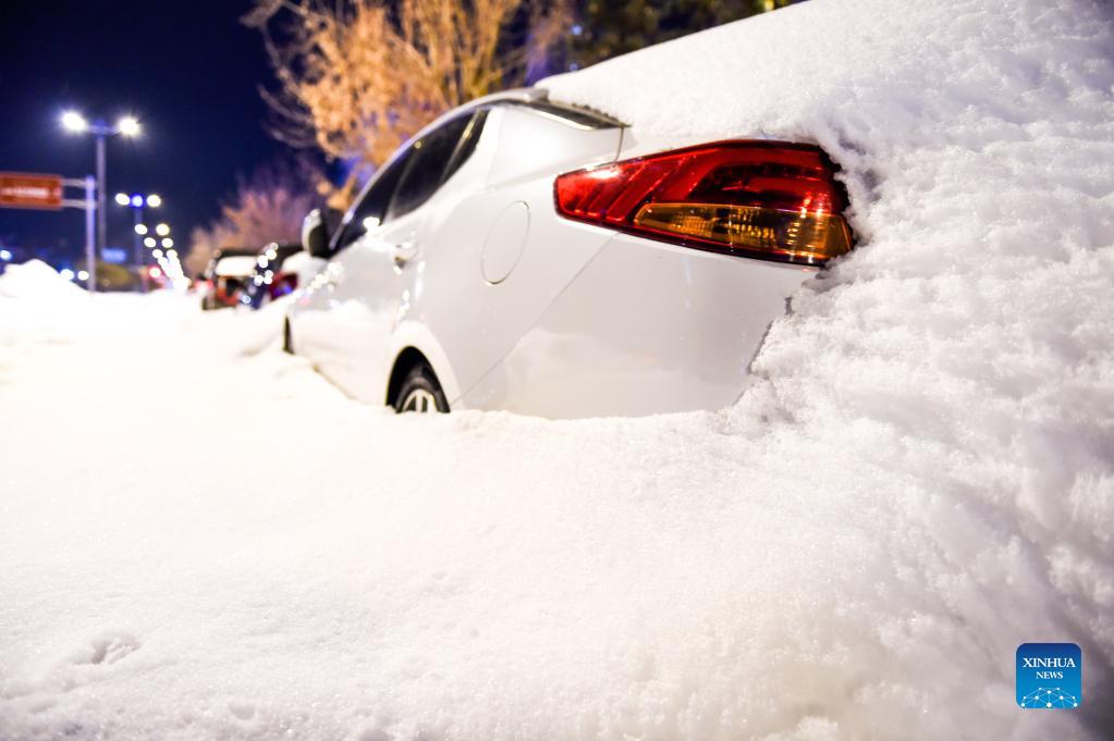 Cars covered by snow are seen in Tongliao, north China's Inner Mongolia Autonomous Region, Nov. 10, 2021. Cities of Tongliao and Chifeng in north China's Inner Mongolia have been walloped by strong snowstorms recently. The snow removing operations have been carried out by local governments to resume transportation as well as agricultural and husbandry production. (Xinhua/Liu Lei)