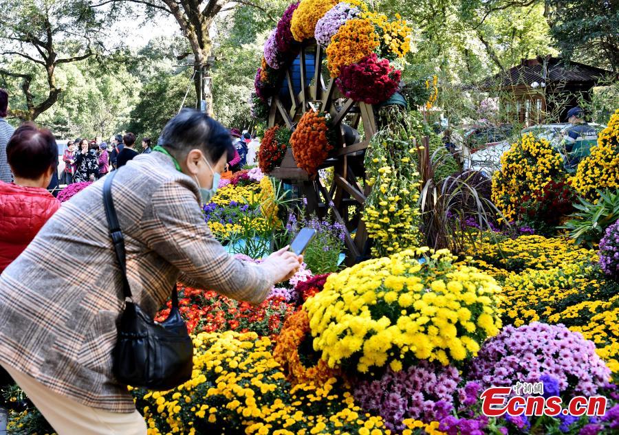 People take photos of colorful chrysanthemums at the second Yangtze River Delta Chrysanthemum Show in Hangzhou Botanical Garden, Zhejiang Province, Nov. 10, 2021. (Photo/Zhang Yin)
