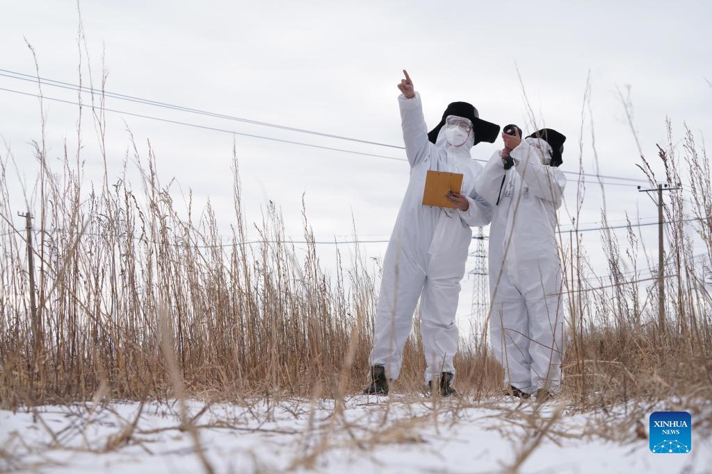 Members of a power maintenance team inspect the outdoor power equipment in Aihui District of Heihe, northeast China's Heilongjiang Province, Nov. 11, 2021. The State Grid Heihe power supply company temporarily set up a comprehensive team composed of 12 employees to maintain the power supply of important facilities. (Xinhua/Wang Song)