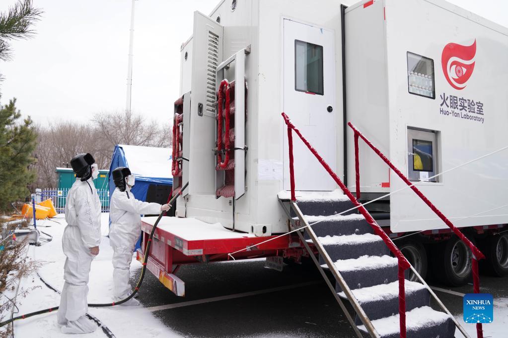 Members of a power maintenance team inspect the power equipment outside a mobile laboratory for nucleic acid testing in Aihui District of Heihe, northeast China's Heilongjiang Province, Nov. 10, 2021. The State Grid Heihe power supply company temporarily set up a comprehensive team composed of 12 employees to maintain the power supply of important facilities. (Xinhua/Wang Song)