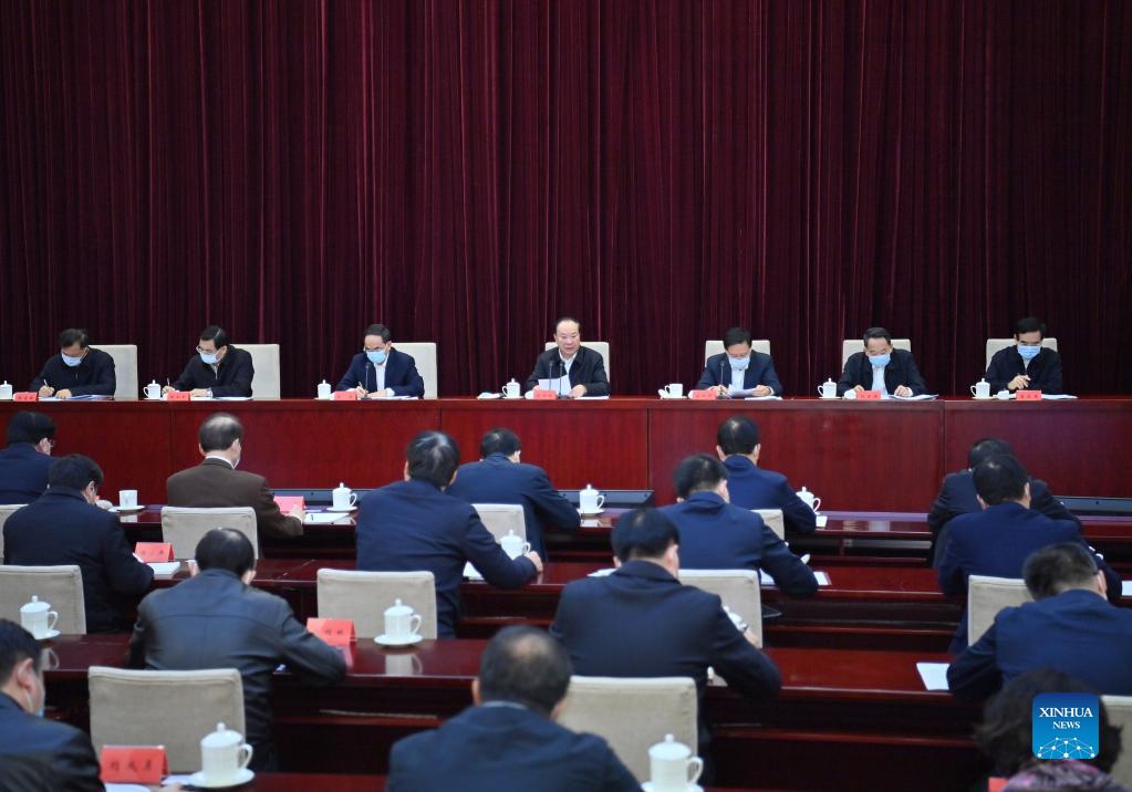 Huang Kunming, a member of the Political Bureau of the Communist Party of China (CPC) Central Committee and head of the Publicity Department of the CPC Central Committee, attends a teleconference on studying and promoting the spirit of the sixth plenary session of the 19th CPC Central Committee in Beijing, capital of China, Nov. 11, 2021. (Xinhua/Yue Yuewei)