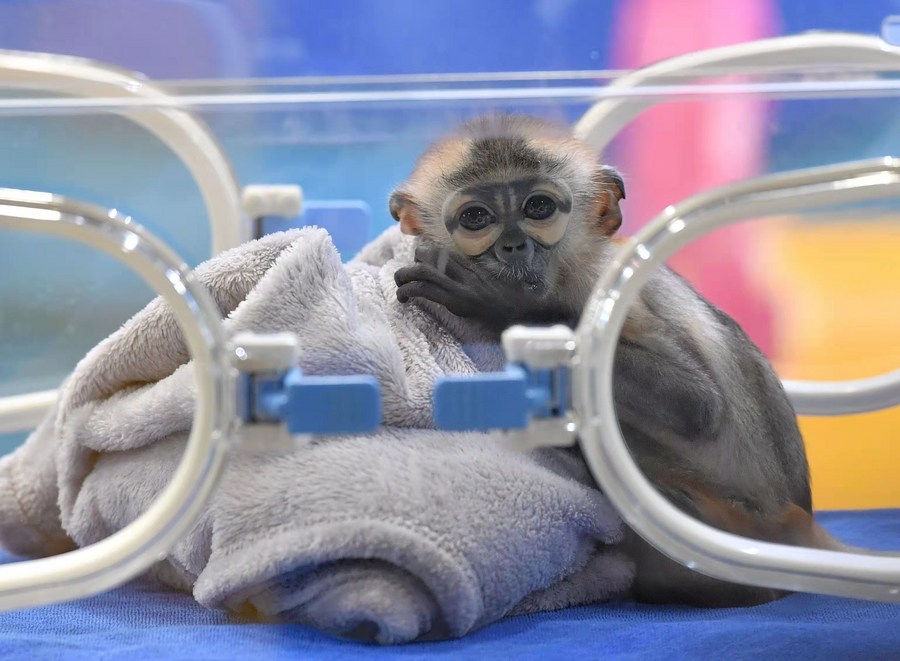 Photo taken on Nov. 10, 2021 shows the newborn Black-shanked Douc Langur in an incubator at Chimelong Primate Research Center in Guangzhou, capital of south China's Guangdong Province. (Xinhua/Liu Dawei)