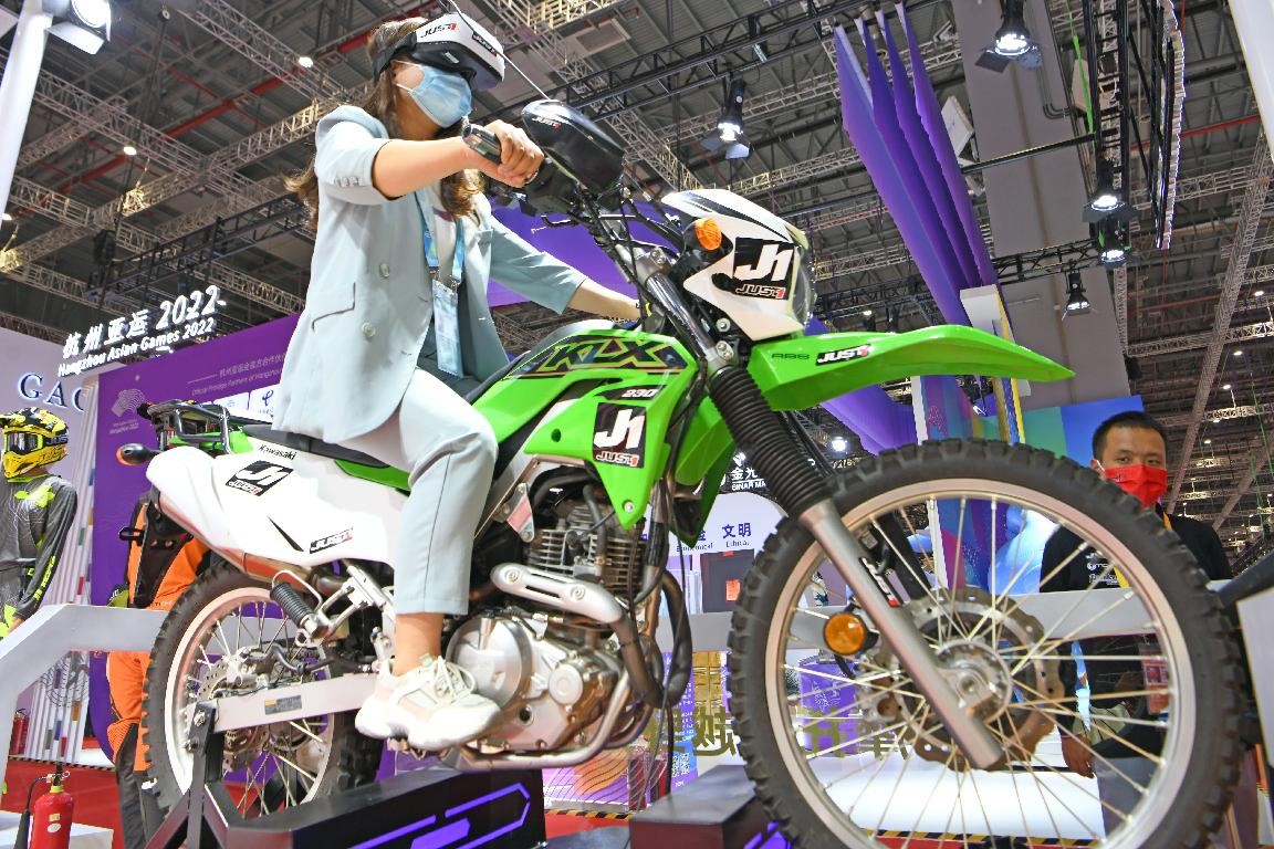 A visitor tries riding a motorcycle with the help of a virtual reality (VR) device at the 4th China International Import Expo (CIIE), Nov. 6, 2021. (People’s Daily Online/Chen Bin)