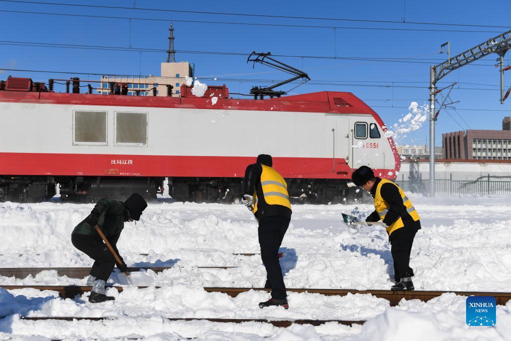 Staff members clean snow on the railway line at Tongliao railway station in Tongliao, north China's Inner Mongolia Autonomous Region, Nov. 11, 2021. Tongliao City in north China's Inner Mongolia has been walloped by the strongest snowstorm ever recorded. Faced with the recent cold weather and snowstorms, the local authorities have launched an emergency program to ensure transportation safety, power supply as well as agricultural and husbandry production, guaranteeing people's normal life. (Xinhua/Liu Lei)