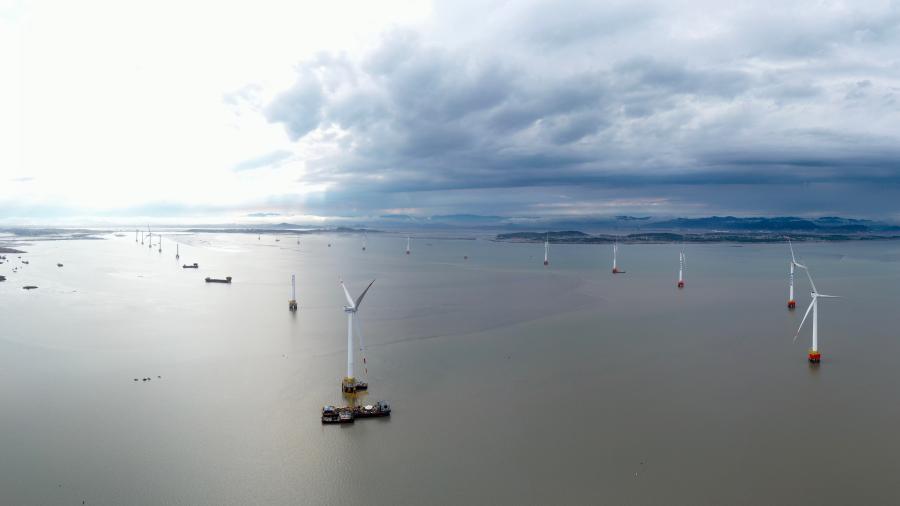 The aerial photo taken on May 28, 2021, shows an offshore wind power project under construction in Fujian Province. (Xinhua/Jiang Kehong)