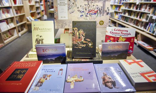 Photo taken on Oct. 22, 2019 shows the "Chinese Bookshelf" at Foyles Bookstore in London, Britain. (Photo/Xinhua)