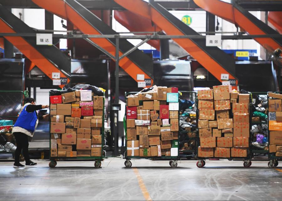 Staff members transport packages at a logistics center during the "Double Eleven" online shopping festival in Zhengzhou, central China's Henan Province, Nov. 11, 2021. (Xinhua/Zhang Haoran)