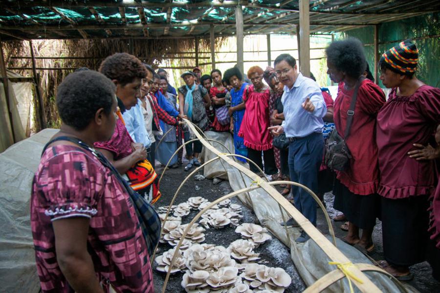 Lin Yingxing (C), specialist from the Fujian Agriculture and Forestry University, explains Juncao technology to local residents in the Eastern Highlands Province of Papua New Guinea, Dec. 19, 2019. (Xinhua/Hu Yingping)