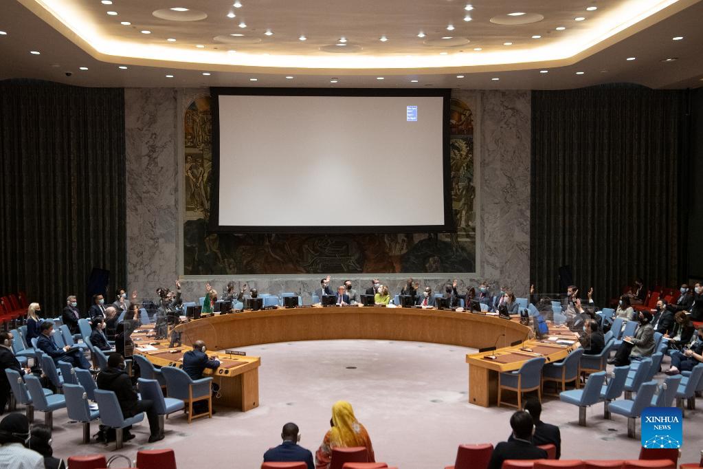 Representatives vote during a UN Security Council meeting at the UN headquarters in New York, on Nov. 12, 2021. The Security Council on Friday adopted a resolution to extend the mandate of the UN peacekeeping mission in the Central African Republic (CAR) for another 12 months, till Nov. 15, 2022. (Eskinder Debebe/UN Photo/Handout via Xinhua)