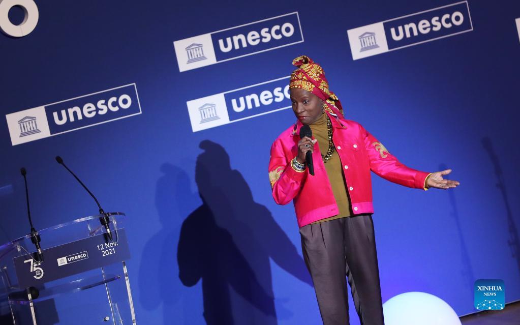 A singer performs during a celebration event of the 75th anniversary of the United Nations Educational, Scientific and Cultural Organization (UNESCO) in Paris, France, Nov. 12, 2021. Some 28 heads of state and government gathered Friday evening in Paris to celebrate the 75th anniversary of the UNESCO. (Xinhua/Gao Jing)