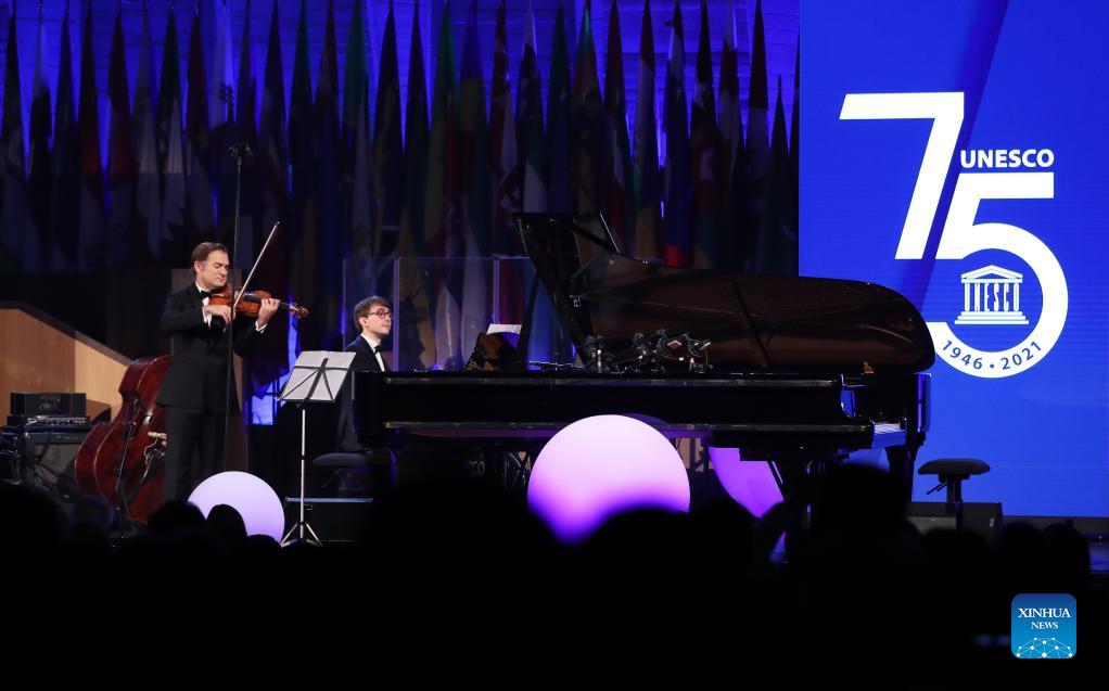 Musicians play during a celebration event of the 75th anniversary of the United Nations Educational, Scientific and Cultural Organization (UNESCO) in Paris, France, Nov. 12, 2021. Some 28 heads of state and government gathered Friday evening in Paris to celebrate the 75th anniversary of the UNESCO. (Xinhua/Gao Jing)