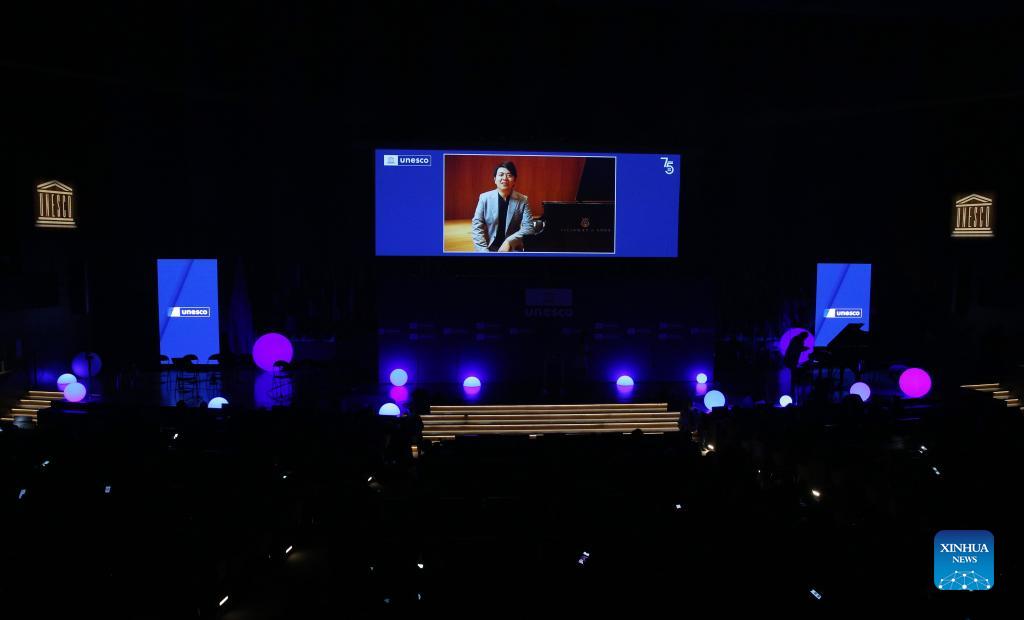 Chinese pianist Lang Lang delivers a video message during a celebration event of the 75th anniversary of the United Nations Educational, Scientific and Cultural Organization (UNESCO) in Paris, France, Nov. 12, 2021. Some 28 heads of state and government gathered Friday evening in Paris to celebrate the 75th anniversary of the UNESCO. (Xinhua/Gao Jing)