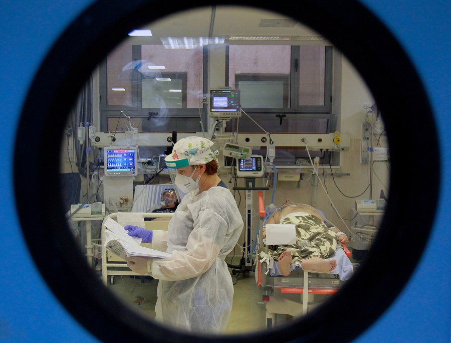 A medical worker treats COVID-19 patients in an ICU of the University Emergency Hospital in Bucharest, Romania, Nov. 4, 2021. (Photo by Cristian Cristel/Xinhua)