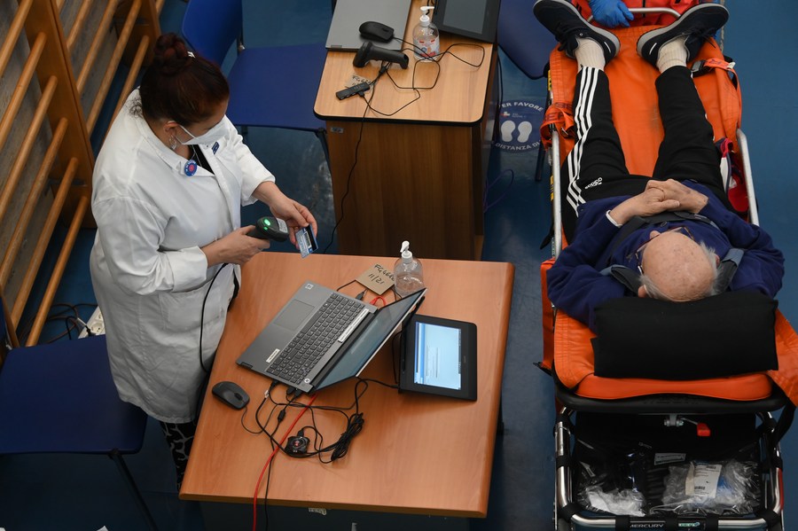 A recipient gets registered for a COVID-19 booster vaccine at Santo Spirito hospital in Rome, Italy, Sept. 21, 2021. (Photo by Alberto Lingria/Xinhua)
