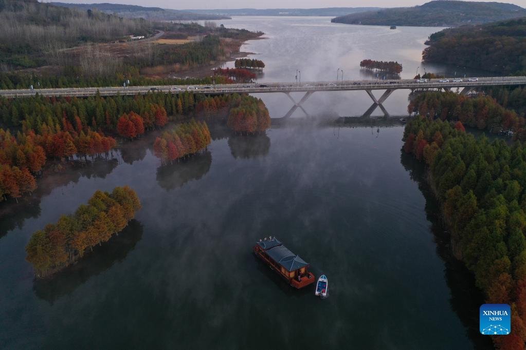 Aerial photo taken on Nov. 14, 2021 shows a winter landscape of Tianquan Lake in Xuyi County, east China's Jiangsu Province. (Xinhua/Ji Chunpeng)