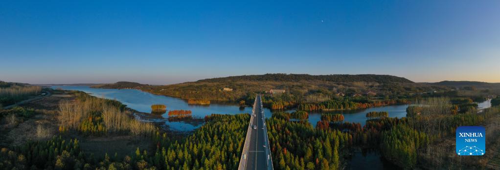 Panorama photo taken with a drone on Nov. 13, 2021 shows a winter landscape of Tianquan Lake in Xuyi County, east China's Jiangsu Province. (Xinhua/Ji Chunpeng)