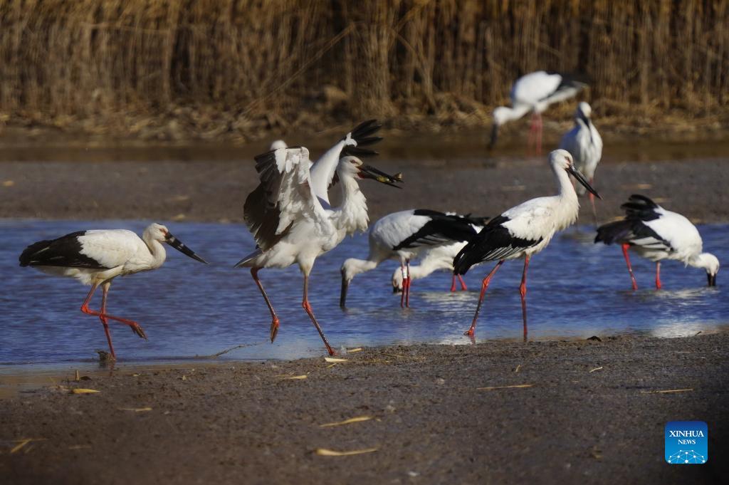 A flock of oriental white storks forage during their southward migration at Caofeidian wetland in Tangshan, north China's Hebei Province, Nov. 14, 2021. The Caofeidian wetland, located in the city of Tangshan, is an important spot for the migratory bird species which is under first-class national protection and is listed as "endangered" by the International Union for Conservation of Nature. (Xinhua/Yang Shiyao)