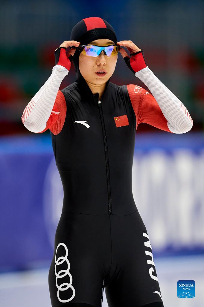 Li Qishi of China reacts during the women's 1500m division A race at the ISU Speed Skating World Cup in Tomaszow Mazowiecki, Poland, Nov. 14, 2021. (Photo by Rafal Oleksiewicz/Xinhua)