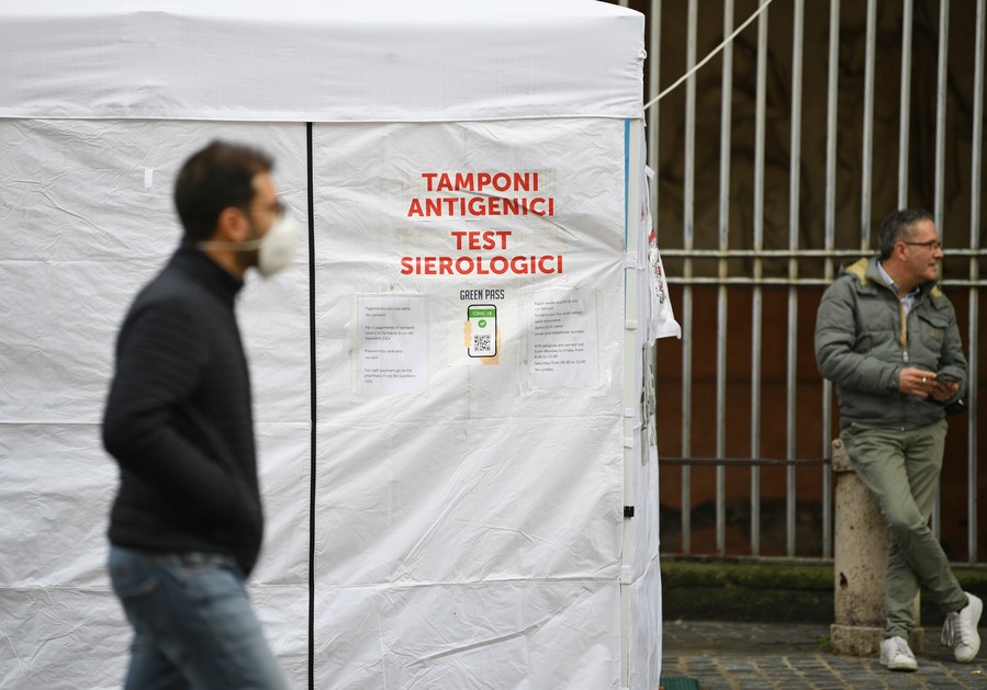 A man walks past a COVID-19 rapid test point in Rome, Italy, Nov. 11, 2021. (Xinhua/Jin Mamengni)