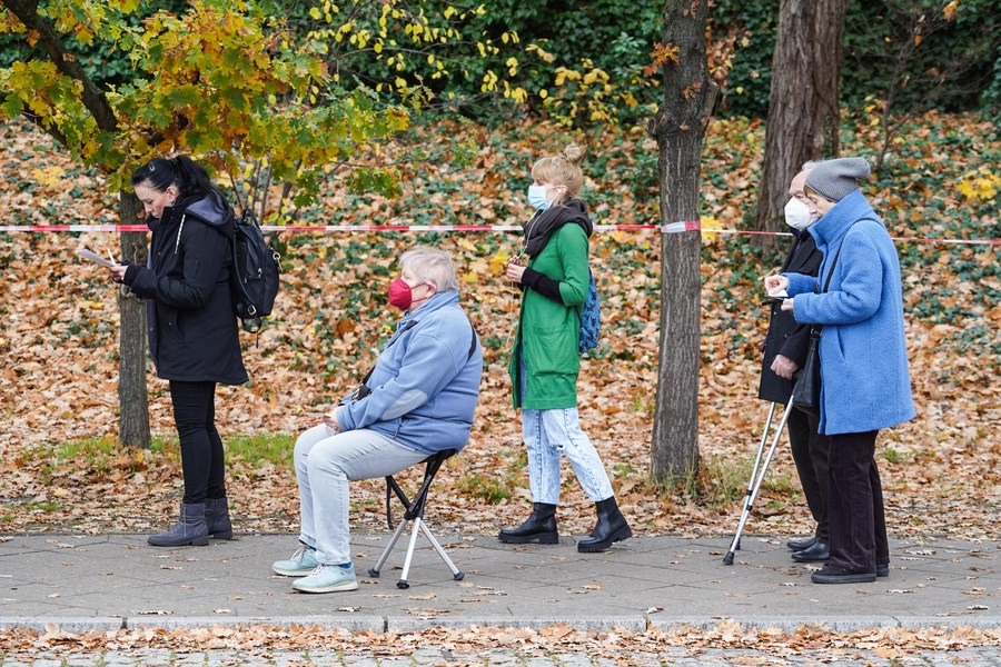 People queue to receive COVID-19 vaccines outside a vaccination center in Berlin, capital of Germany, Nov. 12, 2021. (Photo by Stefan Zeitz/Xinhua)
