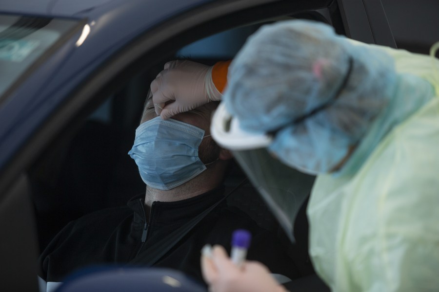 A medical staff member collects a swab sample at a drive-thru COVID-19 testing center in Ljubljana, Slovenia, on Nov. 4, 2021. (Photo by Zeljko Stevanic/Xinhua)