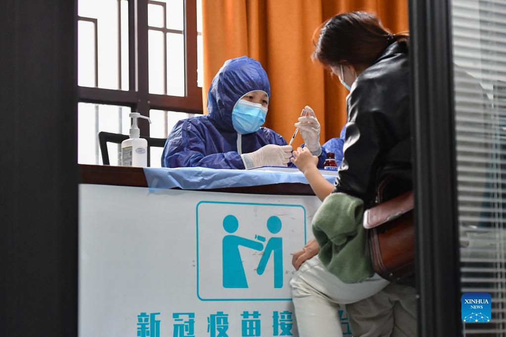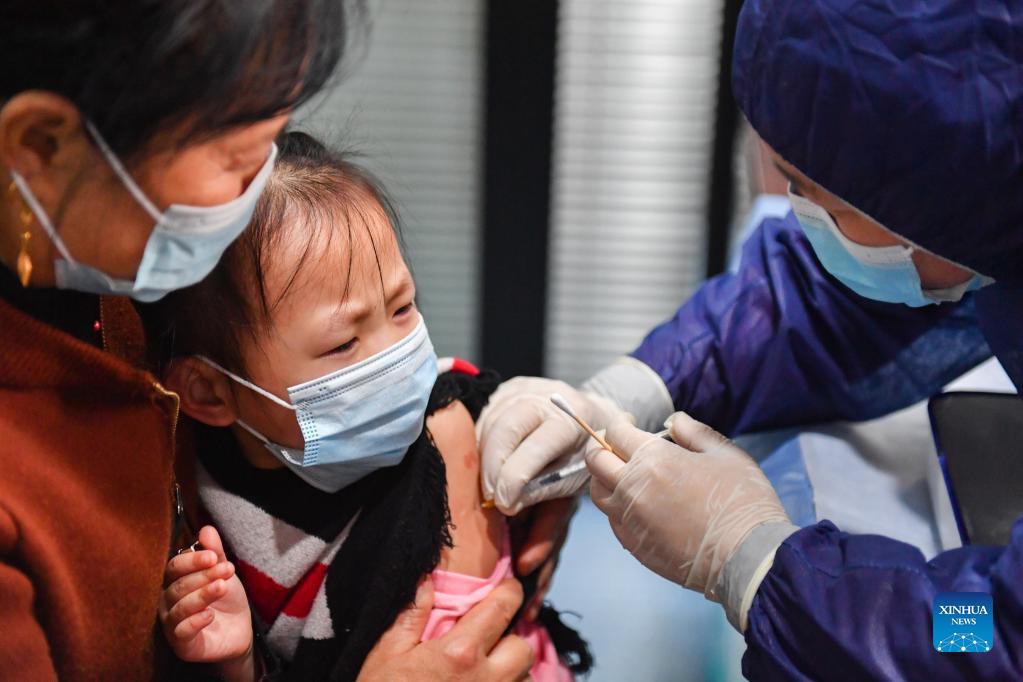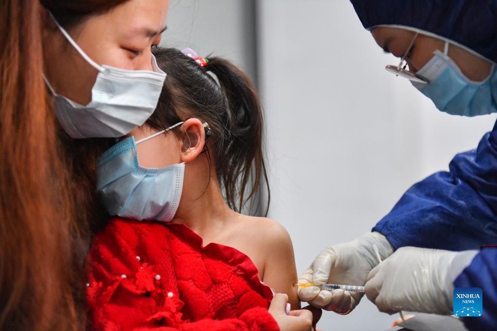 A child receives a dose of COVID-19 vaccine at a community medical service center in Changsha, central China's Hunan Province, Nov. 15, 2021. Changsha has recently launched a COVID-19 vaccination campaign for children aged 3 to 11. (Xinhua/Chen Zeguo)