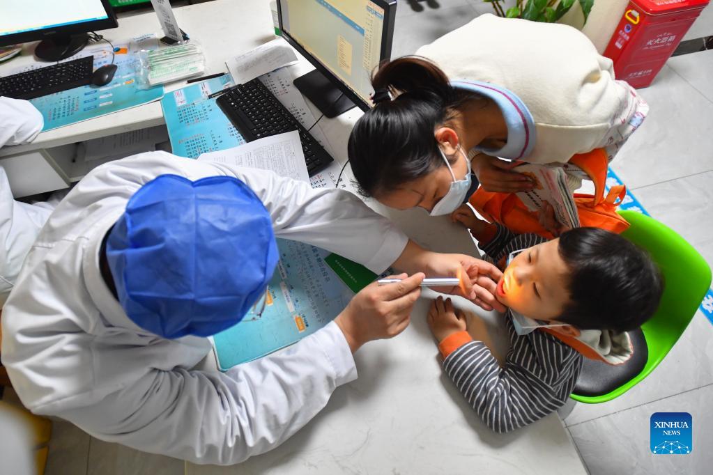 A medical worker checks body condition for a child before administering a dose of COVID-19 vaccine at a community medical service center in Changsha, central China's Hunan Province, Nov. 15, 2021. Changsha has recently launched a COVID-19 vaccination campaign for children aged 3 to 11. (Xinhua/Chen Zeguo)