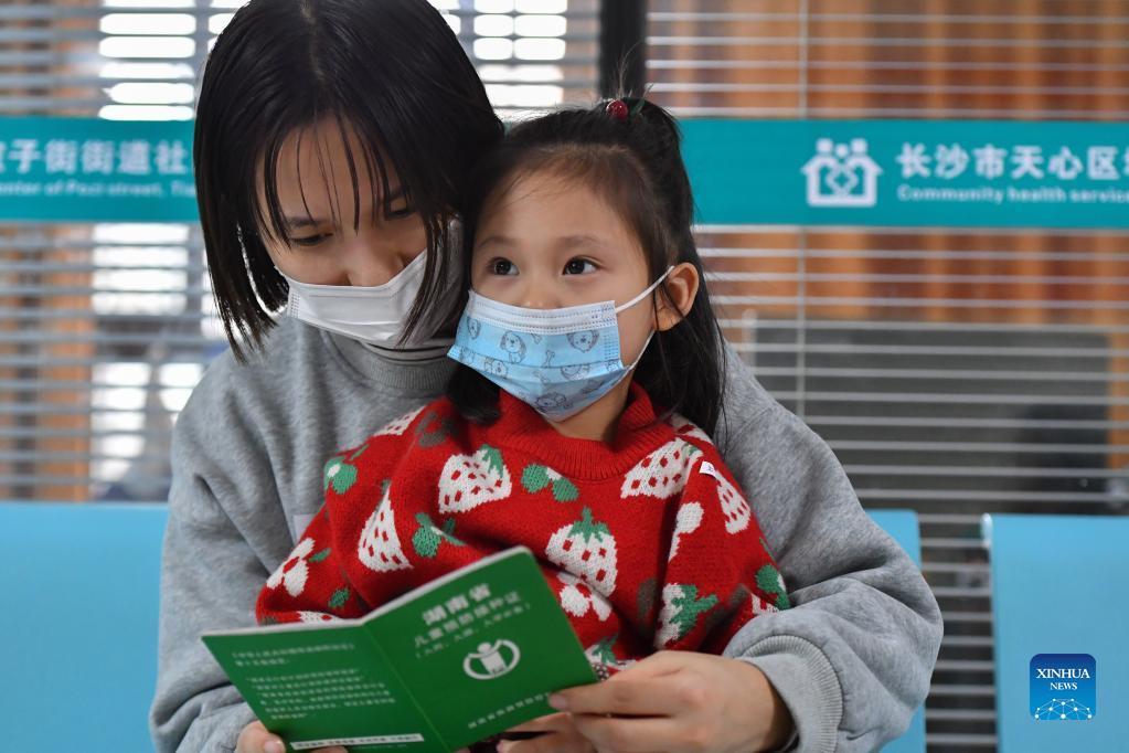 A parent checks the vaccination record of her child at a community medical service center in Changsha, central China's Hunan Province, Nov. 15, 2021. Changsha has recently launched a COVID-19 vaccination campaign for children aged 3 to 11. (Xinhua/Chen Zeguo)