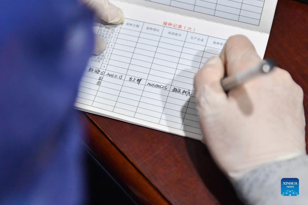 A medical worker registers information for a child after administering a dose of COVID-19 vaccine at a community medical service center in Changsha, central China's Hunan Province, Nov. 15, 2021. Changsha has recently launched a COVID-19 vaccination campaign for children aged 3 to 11. (Xinhua/Chen Zeguo)