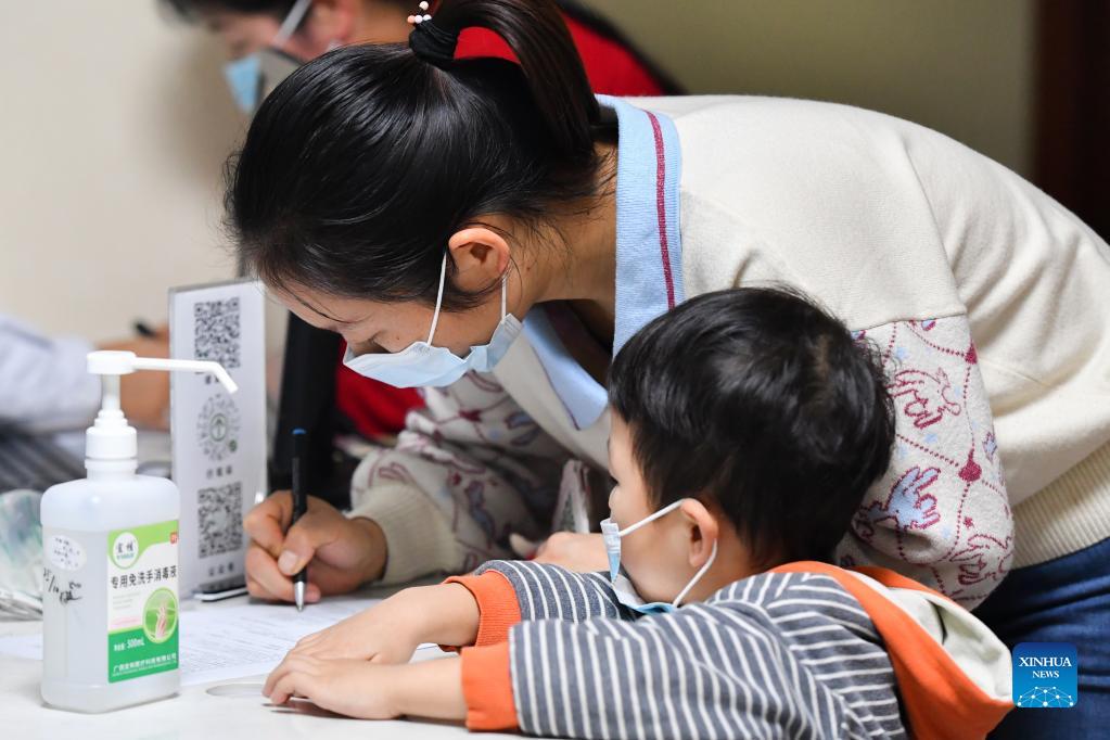 A parent fills in forms for her child for receiving a dose of COVID-19 vaccine at a community medical service center in Changsha, central China's Hunan Province, Nov. 15, 2021. Changsha has recently launched a COVID-19 vaccination campaign for children aged 3 to 11. (Xinhua/Chen Zeguo)