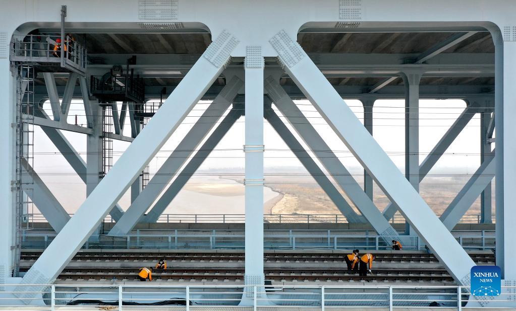 In this aerial photo, staff members inspect a section of Zhengzhou-Jinan high-speed railway, in central China's Henan Province, Nov. 15, 2021. The Zhengzhou-Puyang section in Henan Province of Zhengzhou-Jinan high-speed railway are undergoing the final check and acceptance inspection. (Xinhua/Li An)
