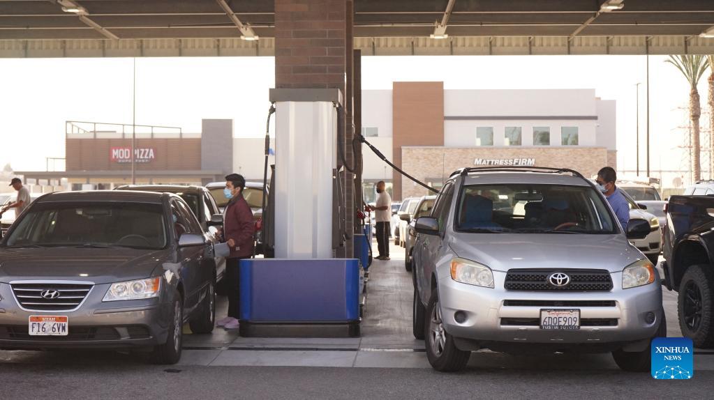 Vehicles queue to refuel at a gas station in Los Angeles, California, the United States, on Nov. 15, 2021. The average price of gas in California reached 4.682 U.S. dollars per gallon on Monday, setting a new record for the most populous U.S. state for a second consecutive day. According to the American Automobile Association (AAA), the average price for regular gasoline was 4.676 U.S. dollars per gallon on Sunday, which already beat the state's previous record of 4.671 dollars for regular gasoline set in October 2012. (Photo by Zeng Hui/Xinhua)