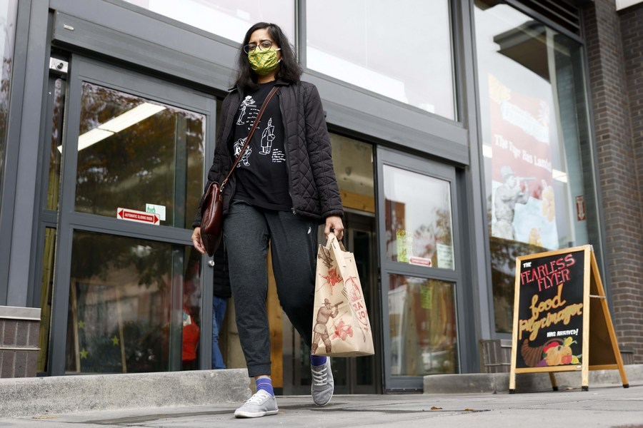 A customer walks out of a supermarket with a bag of groceries in Washington, D.C., the United States, on Nov. 12, 2021.(Photo by Ting Shen/Xinhua)