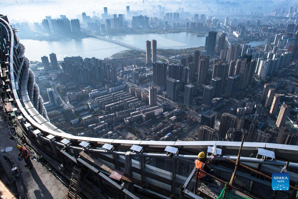 Photo taken on Nov. 15, 2021 shows the construction site of Greenland Center in Wuhan, central China's Hubei Province. Construction on Wuhan Greenland Center, a skyscraper project, has come to the final stage. (Xinhua/Xiao Yijiu)