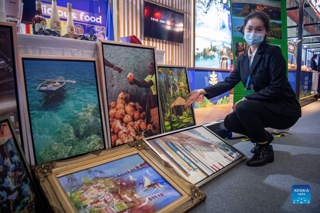 A staff member displays exhibits at an exhibition of the 14th China-LAC Business Summit in southwest China's Chongqing, Nov. 16, 2021. The summit kicked off Tuesday here in Chongqing. (Xinhua/Tang Yi)