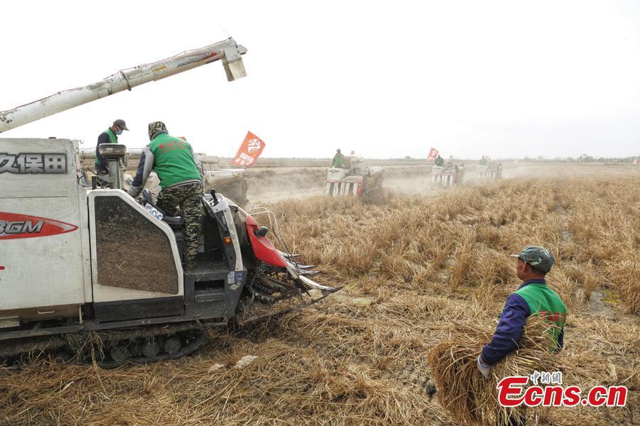 Workers harvest seawater rice developed by the late scientist Yuan Longping and his team at a planting base in Jinghai District, north China's Tianjin municipality, Nov. 15, 2021. (Photo: China News Service/Tong Yu)