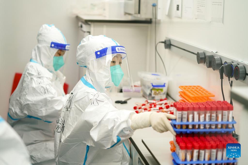 Liu Bing (R) tests nucleic acid samples at a nucleic acid test laboratory named Huoyan, or Fire Eye, in Heihe City, northeast China's Heilongjiang Province, Nov. 15, 2021. Liu Bing, a 24-year-old medical worker, acts as a real "virus detective" in the fight against the latest COVID-19 resurgence in Heihe City. The city reported new locally transmitted COVID-19 cases on Oct. 27. Since then, Liu joined other 32 medical workers for nucleic acid testing tasks. Dressed head to toe in protective clothing, Liu has been working around the clock for COVID-19 testing, such as extracting nucleic acid from swab samples. Her body was often drenched in sweat by wearing thick protective suits. "I need to be responsible for each sample, which is to be responsible for people in the city. I must be extremely cautious," Liu, a Heihe local said. (Xinhua/Wang Song)
