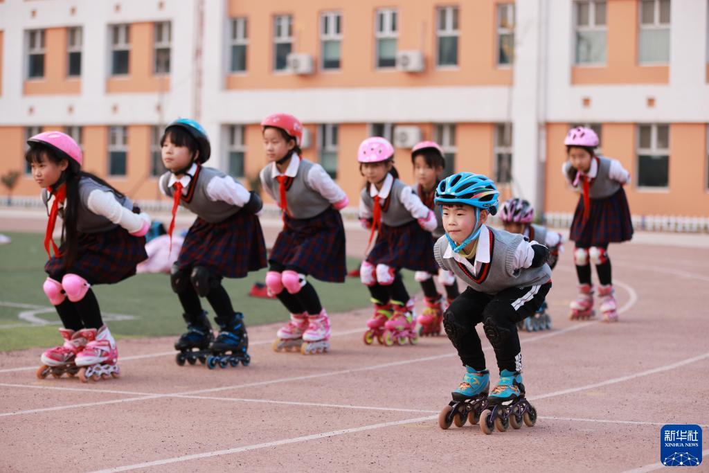Photo taken on Nov. 16, 2021 shows students practicing roller skating at Xinxiguan Primary School in Neiqiu County of Xingtai City, north China's Hebei Province. Students have various options for extra-curricular activities such as calligraphy, sports, and dance which aim to meet the needs of different students and promote their healthy development. (Xinhua/Liu Jidong)