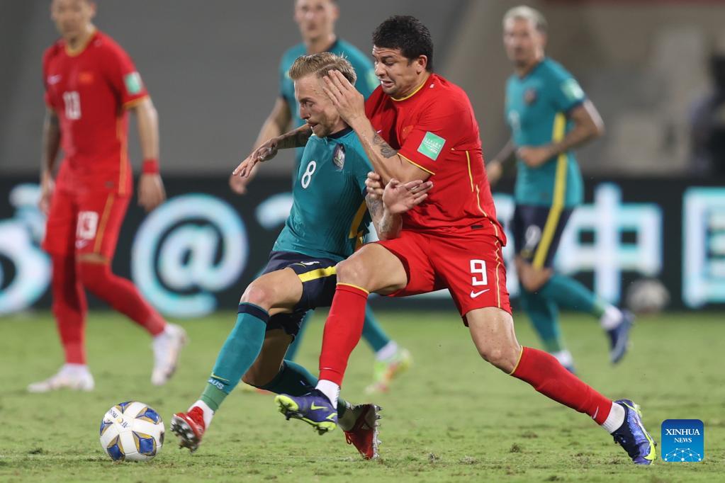 Ai Kesen (R) of China vies with James Jeggo of Australia during a Group B match between China and Australia of 2022 FIFA World Cup Asian qualifiers in Sharjah, the United Arab Emirates, on Nov. 16, 2021. (Xinhua)