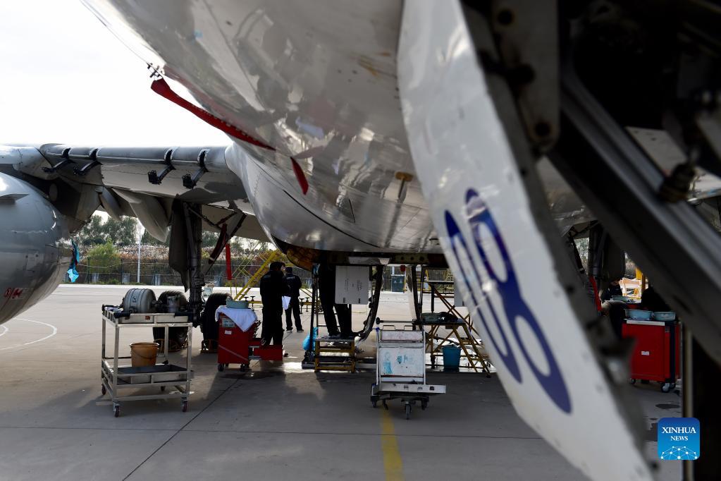 Technicians dismantle an aircraft at Hefei Xinqiao International Airport in Hefei, east China's Ahhui Province, Nov. 15, 2021. Technicians from Anhui Branch of China Eastern Airlines Technic Co., Ltd. have been dismantling a retired Airbus A320 aircraft, which has been in service for 22 years. Aircraft dismantling is a high-tech industrial project of circular economy, which is a measure to promote green and low-carbon development. (Xinhua/Huang Bohan)