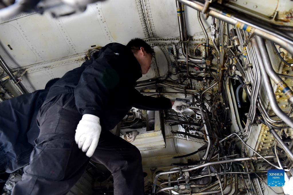 Technicians dismantle an aircraft at Hefei Xinqiao International Airport in Hefei, east China's Ahhui Province, Nov. 15, 2021. Technicians from Anhui Branch of China Eastern Airlines Technic Co., Ltd. have been dismantling a retired Airbus A320 aircraft, which has been in service for 22 years. Aircraft dismantling is a high-tech industrial project of circular economy, which is a measure to promote green and low-carbon development. (Xinhua/Huang Bohan)