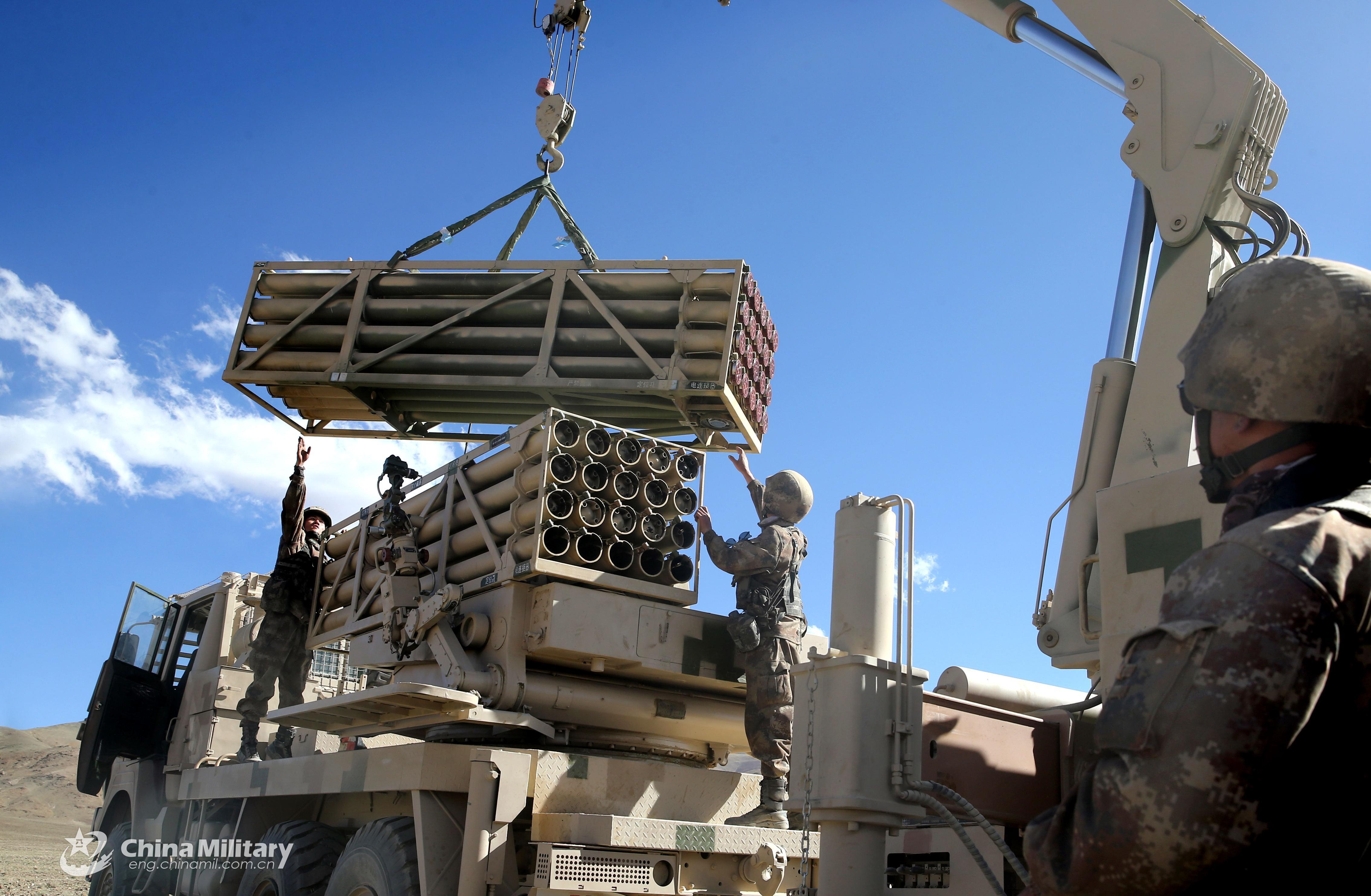 Soldiers assigned to a division under the PLA Xinjiang Military Command use a crane to lift and load rockets onto a military launching truck during a live-fire test in late October, 2021. The training exercise was conducted on the Karakoram Plateau at about 4,500 meters above sea level, with an annual average temperature below -10°C. (eng.chinamil.com.cn/Photo by/ Liu Yong, Li Kang, Zhang Li, Shuai Lijian and Yan Shiqiang)