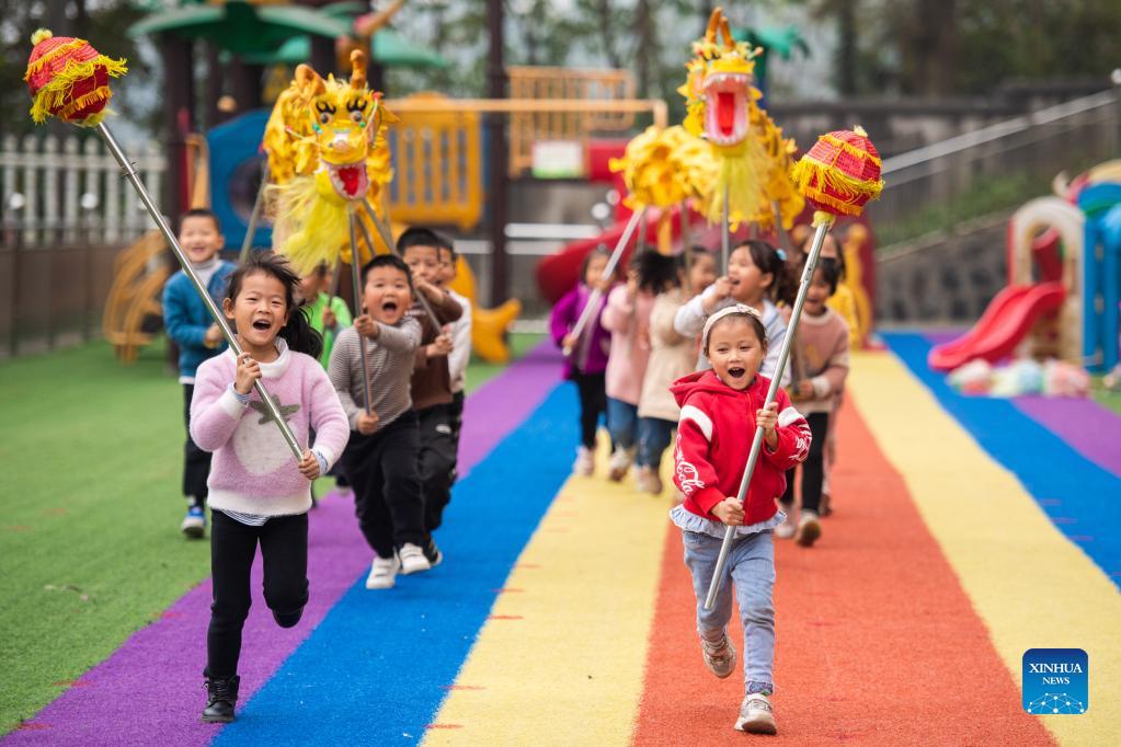 Children practice dragon dance at a kindergarten in Yaotianping Town in Dingcheng District of Changde, central China's Hunan Province, Nov. 17, 2021. The kindergarten invited folk artists to give a dragon dance and lion dance lesson to the children, providing small kids an opportunity to have a close watch on the local intangible cultural heritage. (Xinhua/Chen Sihan)