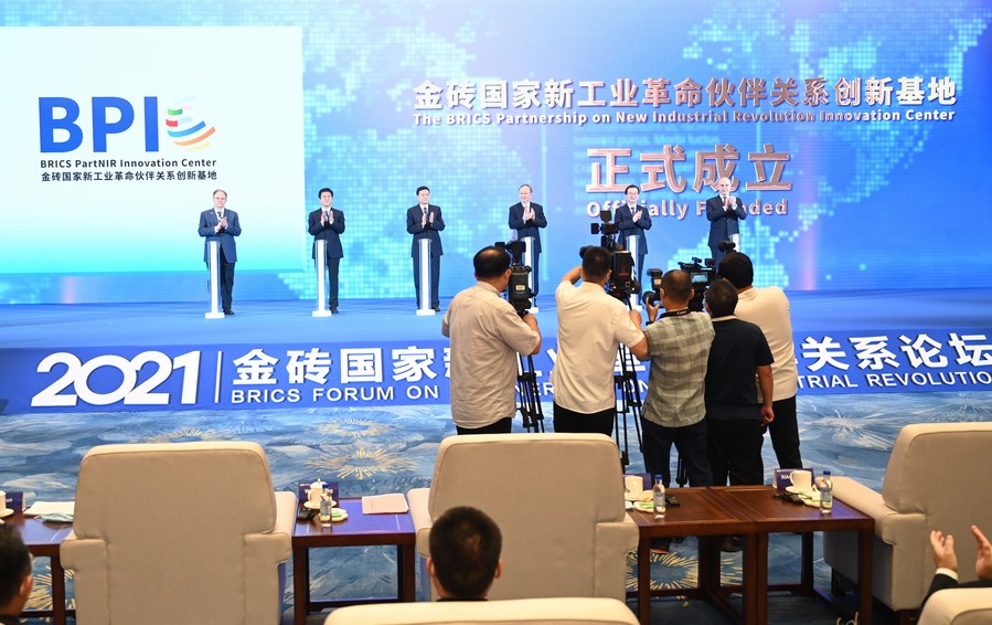 Photo taken on Sept. 7, 2021 shows the inauguration ceremony of the BRICS Partnership on New Industrial Revolution Innovation Center in Xiamen, southeast China's Fujian Province. (Xinhua/Lin Shanchuan)