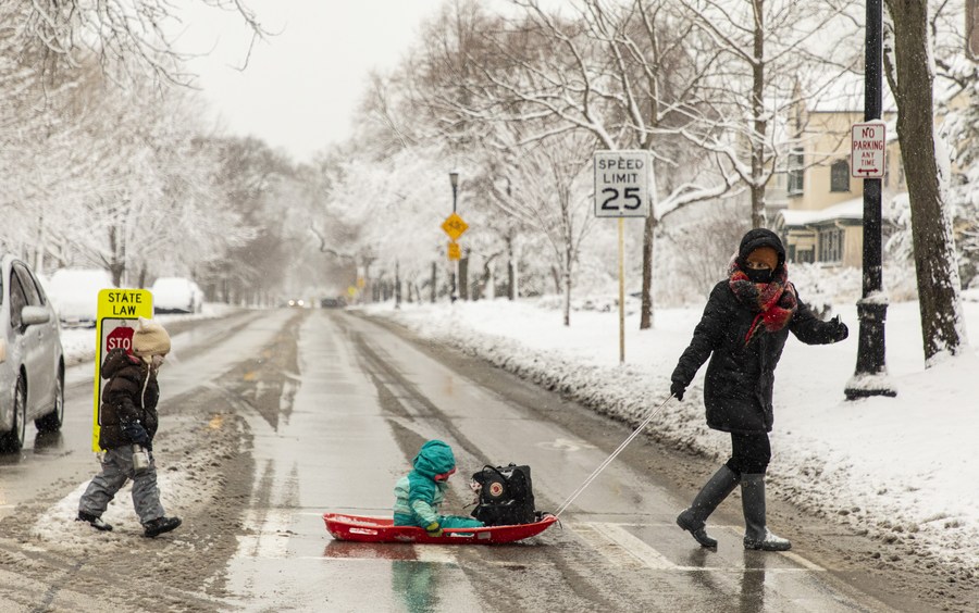 A woman and her children cross a road in Evanston, north of Chicago, Illinois, the United States, on Jan. 26, 2021. (Photo by Joel Lerner/Xinhua)