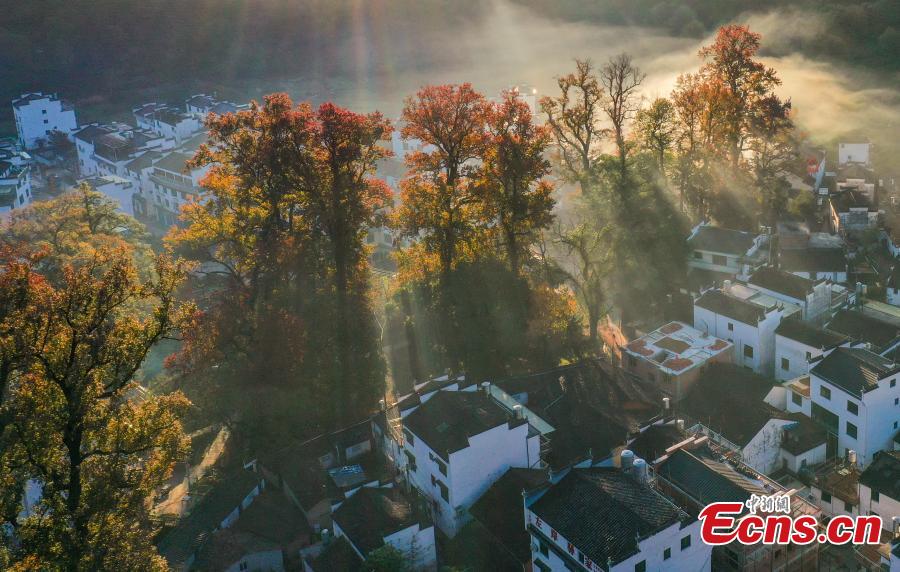 Maple leaves turn red in Shicheng village, East China's Jiangxi Province. Red leaves and white-and-gray-hued Hui-style architecture make a picturesque scenery. (Photo: China News Service/Hu Dunhuang)
