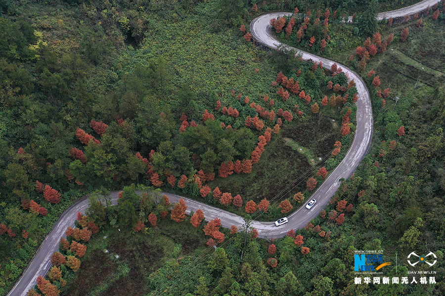 Photo taken on Nov. 15, 2021 shows that vehicles drive on the road next to Yingtao Village, Runxi Township, Pengshui Miao-Tujia Autonomous County, southwest China's Chongqing. (Xinhuanet/ZhaoYong)