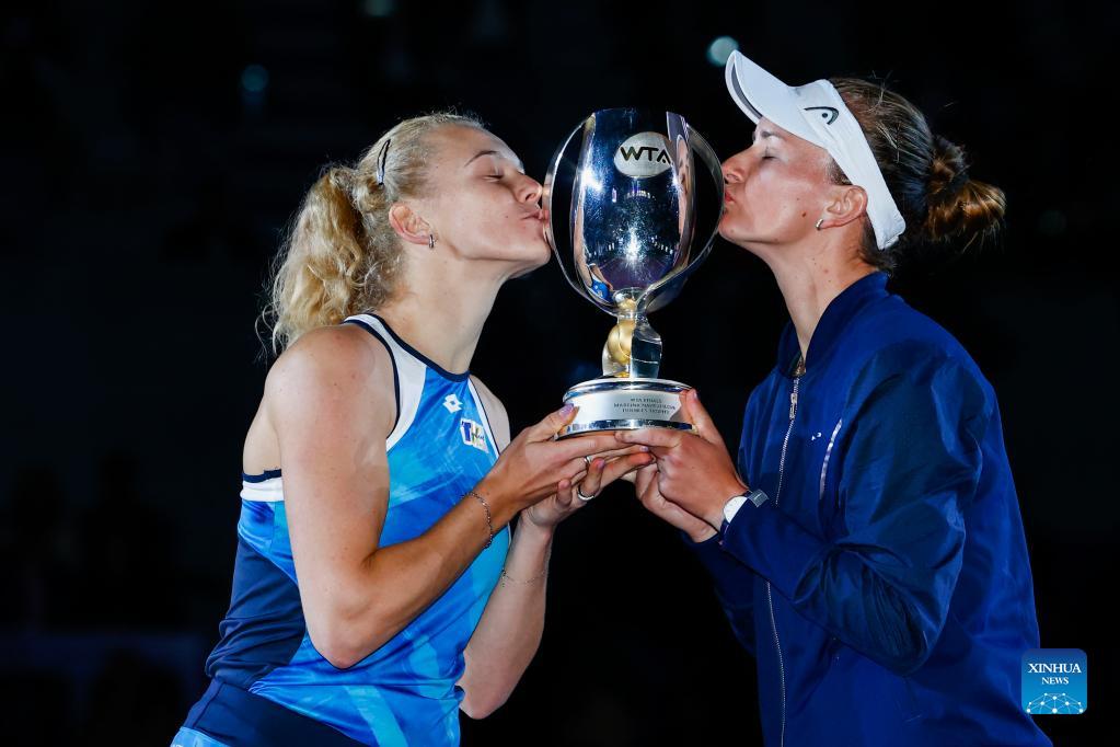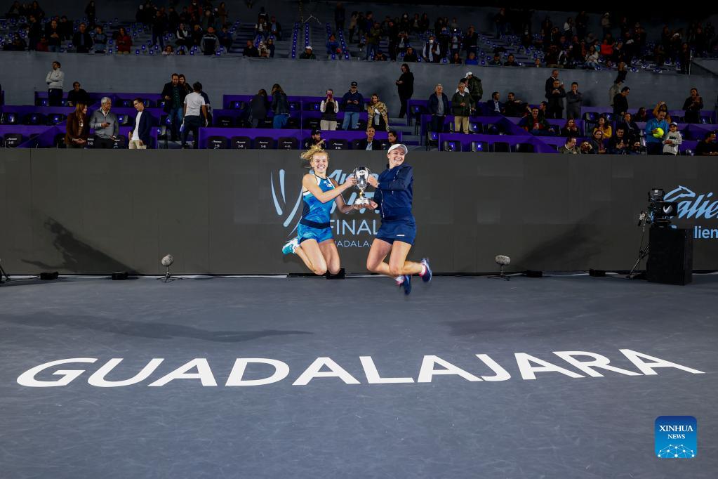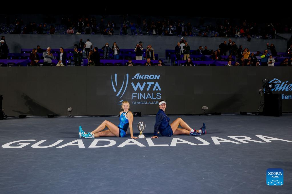 Katerina Siniakova (L) and Barbora Krejcikova of the Czech Republic celebrate with the trophy during the awarding ceremony after winning the women's doubles final against Hsieh Su-Wei of Chinese Taipei and Elise Mertens of Belgium at the AKRON WTA Finals in Guadalajara, Mexico, on Nov. 17, 2021. (Photo by Jorge Reyes/Xinhua)