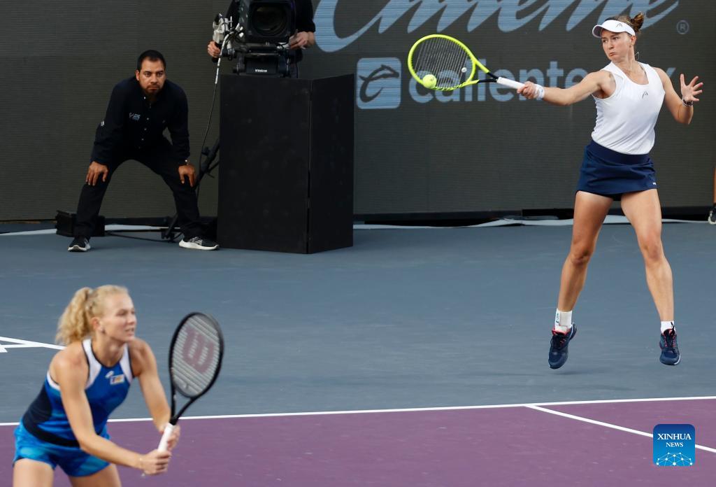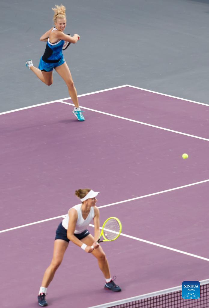 Katerina Siniakova (L) and Barbora Krejcikova of the Czech Republic compete during the women's doubles final against Hsieh Su-Wei of Chinese Taipei and Elise Mertens of Belgium at the AKRON WTA Finals in Guadalajara, Mexico, on Nov. 17, 2021. (Photo by Jorge Reyes/Xinhua)