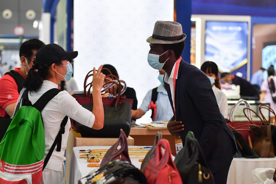 A visitor learns about African products during the Second China-Africa Economic and Trade Expo in Changsha, capital of central China's Hunan Province, Sept. 28, 2021. (Xinhua/Chen Zeguo)